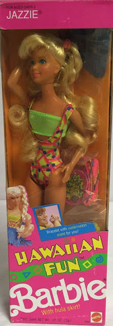 The Jazzie that came to me comes from 1990 from the Hawaiian Fun line. I remember well this line from my childhood, my friend had Barbie Hawaiian Fun. The dolls had Hawaiian hulu skirts and a bracelet with a fragrant pendant attached to them.