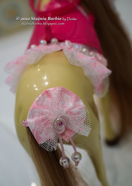The saddle and reins come from Steffi Love's pink horse from the Fairytale Riding Princess set. They are made of a flexible material, similar to that of the Tawny saddle. The bridle is probably also from a Simba horse, a bit older, also dedicated to some princess. It is plastic, but has interesting functions - one is three fasteners - as standard - a noseband and a throat strap - and additionally a header - that is, the occipital strap located behind the ears. For Rossie, undoing the latter is enough. Another interesting feature is the handle on the browband - allowing you to mount the decoration. Brilliant thing!